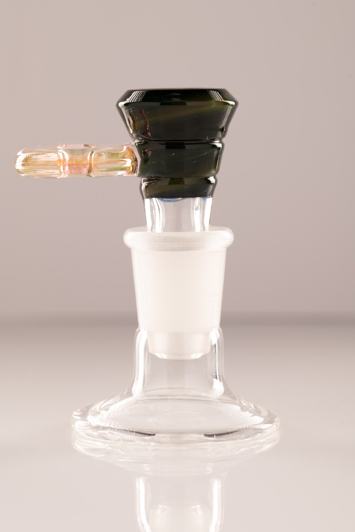 This stunning 14mm gravity well slide by Apache goes crazy! Packed full of space tech in the bowl section with a beautiful fumed "gravity well" donut handle! Sitting on an 18mm joint with a 3-hole screen, this bowl would look great in any collection