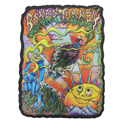 Transform your sesh table with Baked Turkey's Mood Mat Glass Pad, adorned with stunning artwork by Jason Portante. Elevate your smoking experience with this stylish and functional accessory, designed to set the perfect mood for any occasion. Crafted for durability and aesthetic appeal, this glass pad not only protects your heady but also adds a touch of artistic flair.