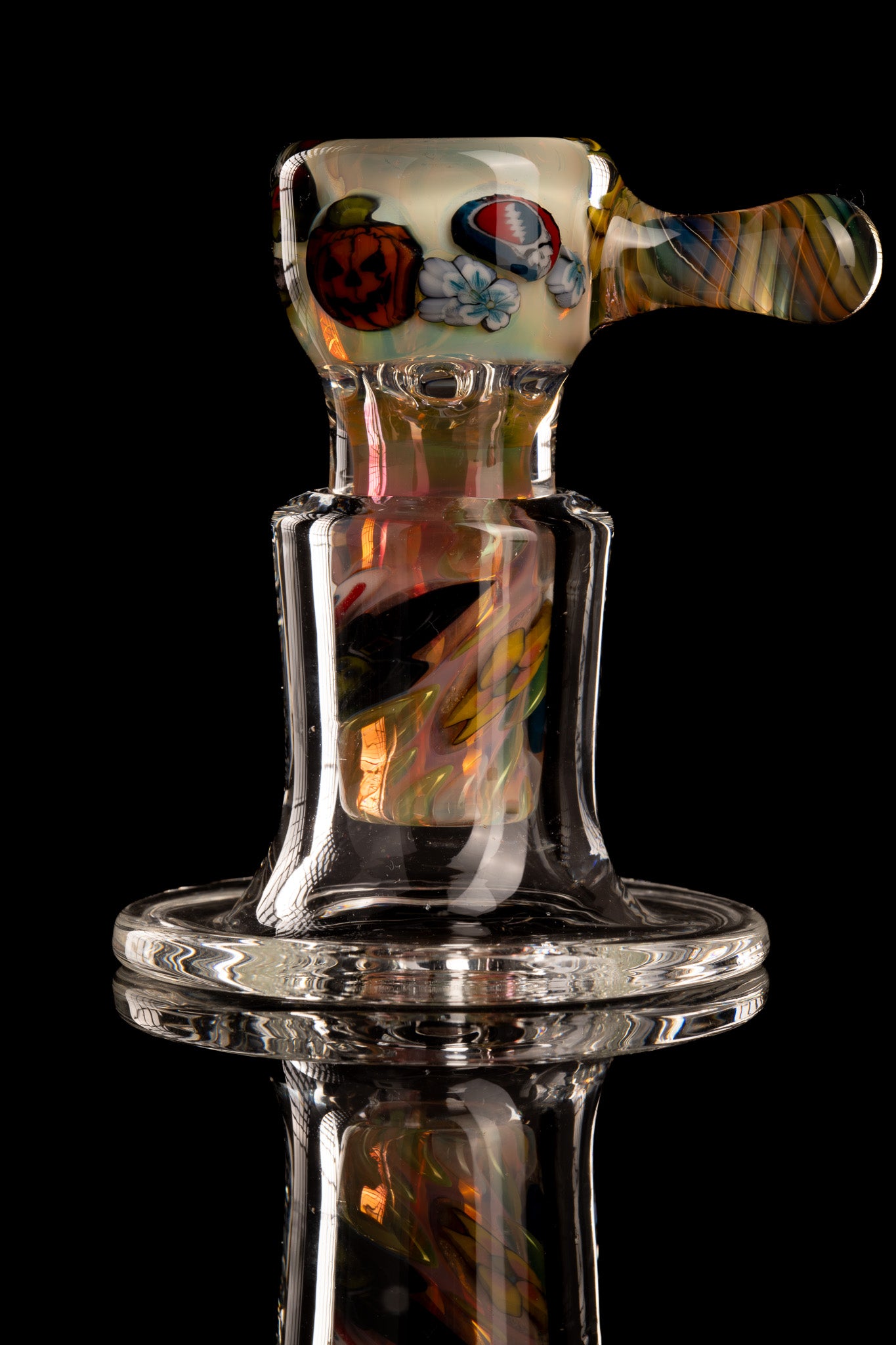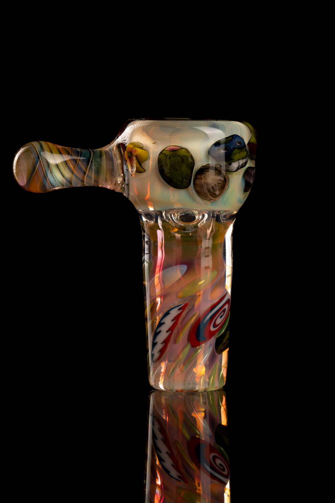 Tombstoned went in on this perfect, fumed out fully worked 18mm 4 hole slide. This piece features some insanely tight fume work and all the millies, all made in-house by Tombstoned Glass